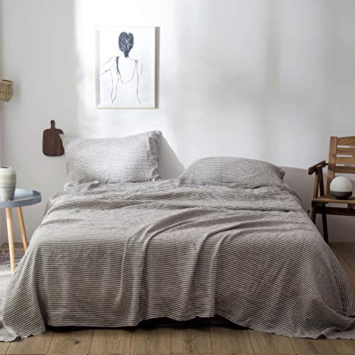 Customer reviews Roore 100% French Linen Bed Sheet Set I 4 Piece Bedding Set (2 Pillow Shams, 1 Flat Sheet, and 1 Fitted Sheet) I Soft Wrinkled Striped Design… (Dark Gray Striped, King)